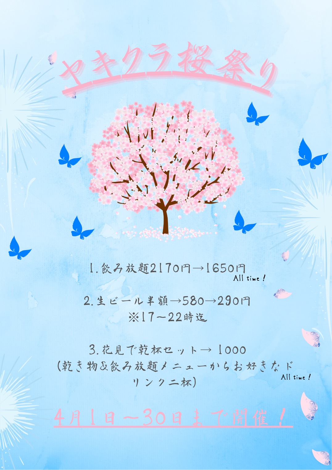 4月1ヶ月間、お得な「やきくら桜祭り」開催